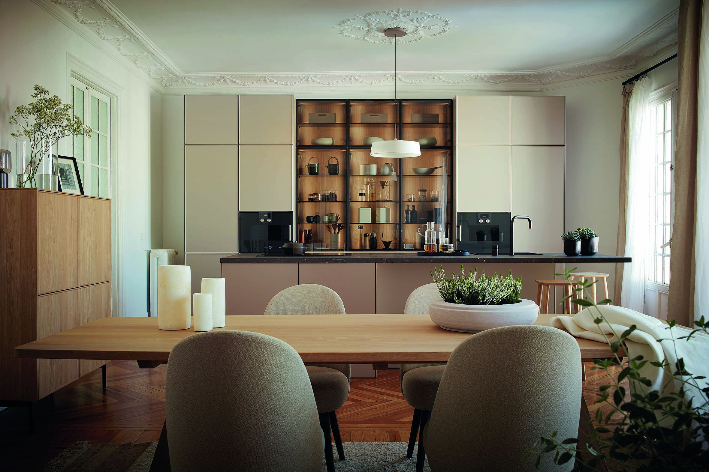 En los últimos años se ha desarrollado un proceso muy marcado que ha llevado a la cocina a recuperar su posición central en el hogar. Hoy ya no se concibe como un lugar de trabajo aislado, sino como un espacio abierto, polivalente y orientado a la convivencia. Esta tendencia hacia espacios unificados y conectados ha diluido las fronteras entre estancias, potenciando el carácter diáfano de la vivienda.