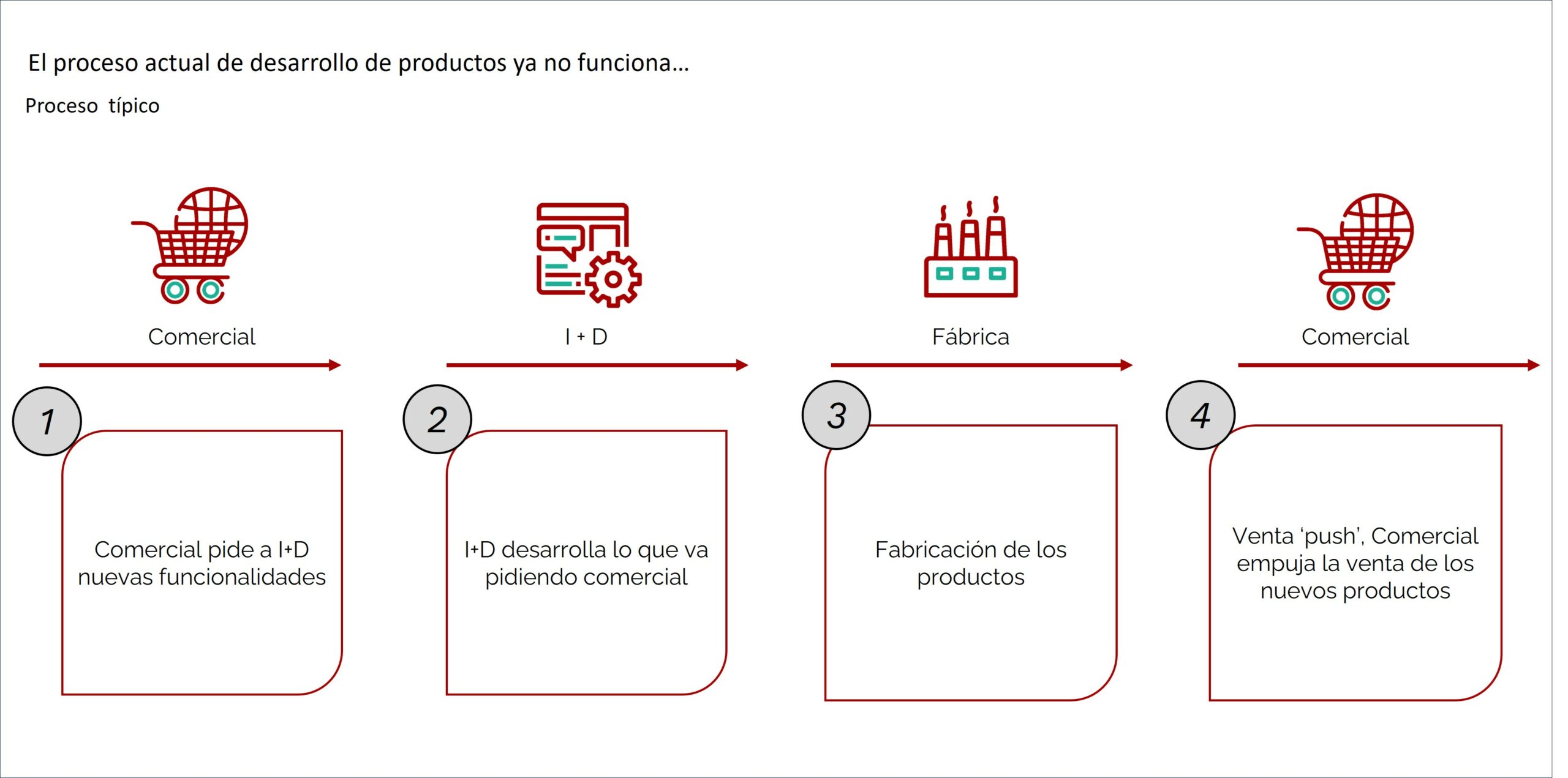 El área comercial suele fijarse en la competencia o en los últimos contratos perdidos para reclamar nuevas funcionalidades al producto. El área de desarrollo (I+D), que ya cuenta con una lista relevante de proyectos en curso, incorpora estas peticiones y, cuando finalmente consigue desarrollarlas, es posible que no logren captar la atención del cliente. Las razones pueden ser diversas: quizá no le interesaban realmente, no se han resuelto como esperaba o, simplemente, no existía una demanda suficiente.